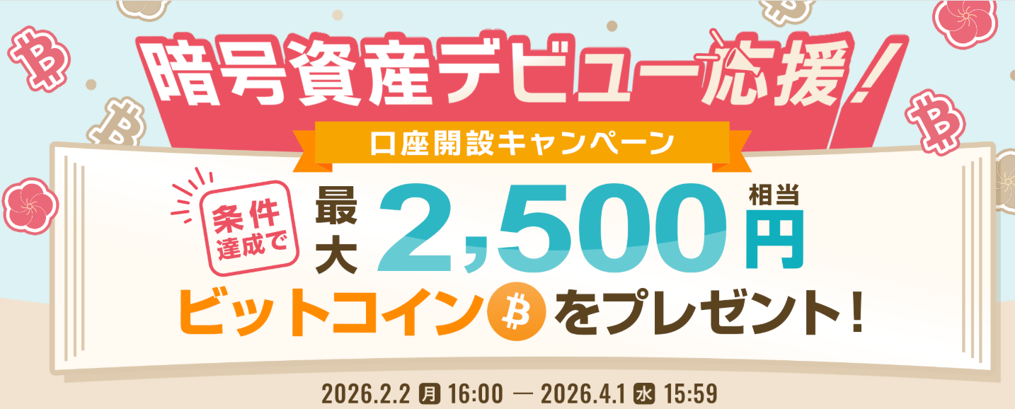 いま口座開設が完了し、条件を満たせば2,500円分のビットコインがもらえます!